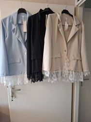 met kant aan de mouwe en kant aan de onderkant van het colbertje